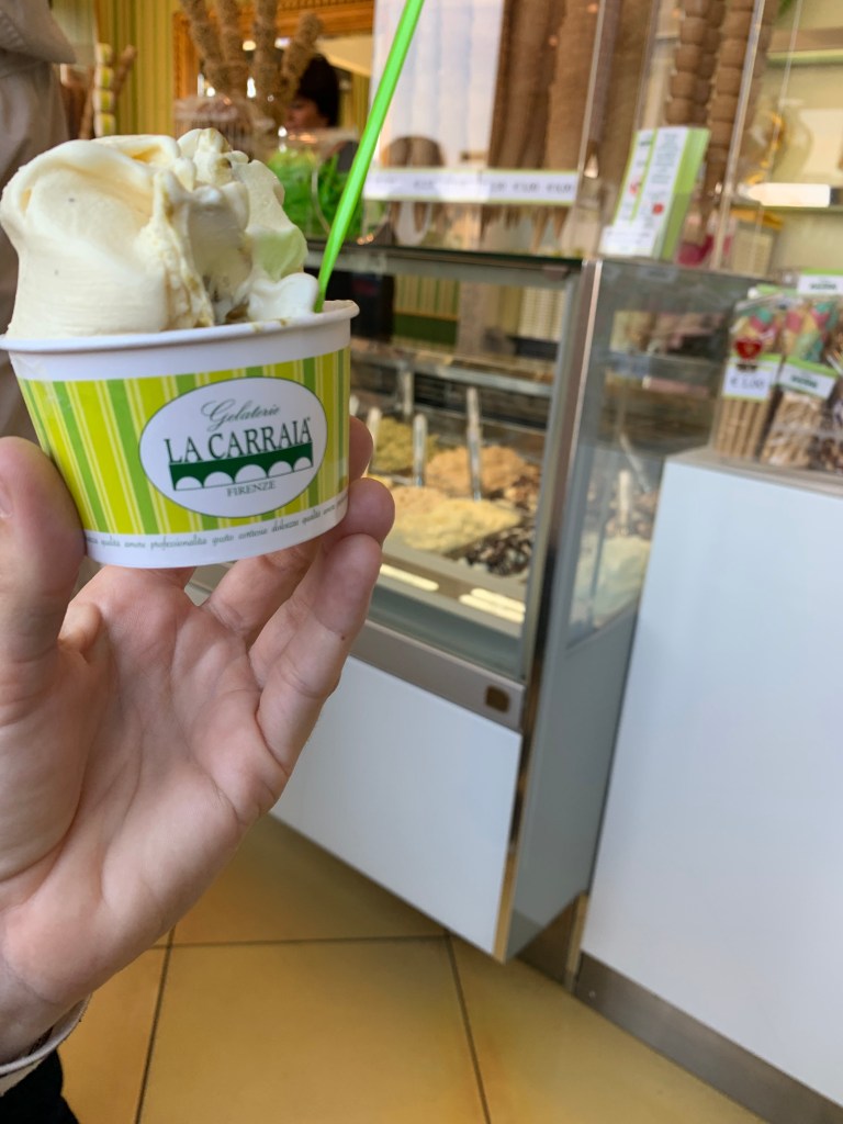 Our last trip to Florence we completed a full gelato bracket, starting with 12 places and narrowing down to our favorite. If you can only get gelato in one place in Italy, get it at Gelateria La Carraia. Don’t just grab Gelato anywhere and assume it’s good – there are about 15 or so authentic gelato shops and the 5-6 best ones are worth seeking out. Other top ones are “Perche No!” (wasn’t our favorite but they are consistently one of the highest reviewed), “RivaReno” (A bit outside of town), “Venchi Cioccolato e Gelato” (one of the mainstays and most popular…will be crowded), “La Strega Nocciola Gelateria Artigianale” (another top 3 for us, right by Ponte Vecchio bridge), “Gelateria dei Neri (our other top 3 – famous for their crema flavor). The most famous flavors to try anywhere you go are pistachio, hazelnut, fig, crema and fiordilatte (“flower of milk”). We got a small crema at each stop as our baseline flavor.